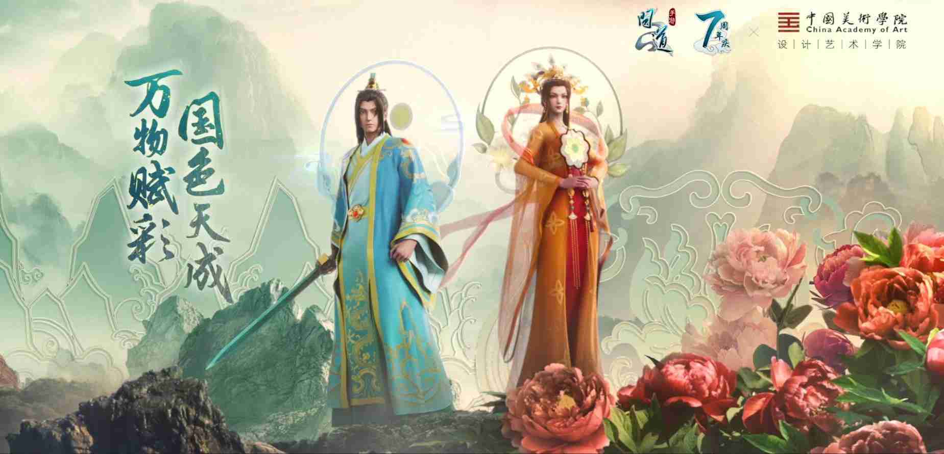 2023年4月,,《问道手游》联动中国美术学院,,在游戏中融合了中国历史上不同时期的文化元素,,,打造了“山河万象”与“凤鸣九霄”的国风时装。。。在色彩配置方面,,,创作团队基于对游戏角色特性的分析提取相应的文化内涵,,从每一种色彩的色相、、指代事物和情感出发对应角色属性,,,,选定服装的色彩搭配。。。。在纹样设计方面,,创作团队结合游戏角色自身特殊的造型比例和形态,,,,在实际的纹样设计中进行了游戏语境下的活化演绎。。男性角色集中使用了如蟒纹、、海水江崖纹、、、、如意纹和云气纹等传统纹样元素,,女性角色则吸纳了凤凰纹、、、、牡丹纹、、、、卷草缠枝纹等元素,,组成以“双凤牡丹纹样”“缠枝牡丹纹”“金玉凤冠头饰”为主要纹样的游戏角色装饰图案系统。。。